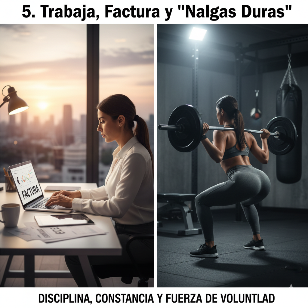 Esta es la parte que sella el empoderamiento personal: el enfoque en el crecimiento personal y físico. El mensaje final es un grito a la autogestión y el bienestar: “Recuerda que corazón roto, nalgas duras. Trabaja, factura y recupera tu poder.” La sanación se consolida en la disciplina personal, la independencia económica y el cuidado del cuerpo.